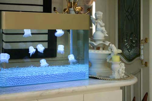 オリジナル薄膜樹脂の浮遊体アートオブジェの透明感を生かすための水槽システムを工夫し続けています。